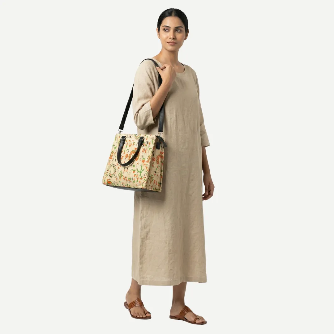 Step into sustainable style with the Zodiio Tribal Art Jute Vanity Tote, a stunning fusion of Indian folk design and everyday practicality. Crafted from premium jute by skilled artisans, this bag features vibrant hand-inspired tribal prints that celebrate India’s artistic heritage.